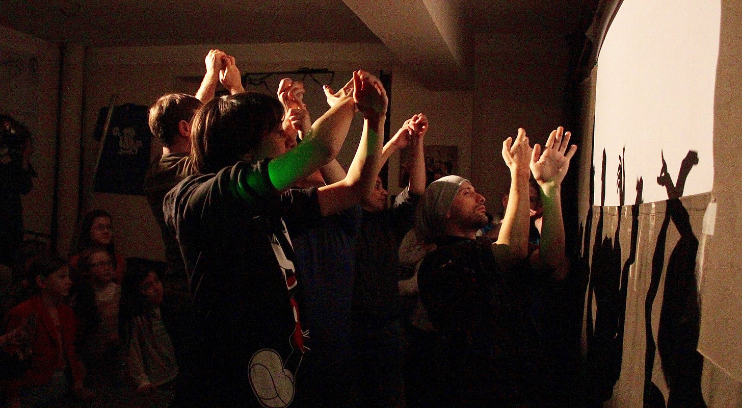 Many shadow puppeteers make animal hand shadows, as does Gela's troupe. But they also do something quite unique in my experience of various European shadow puppet theatres, they make abstract hand shadows. And they do this often to the music of Bach. In early 2019 they premiered a condensed hour and a fifteen minute performance of Bach's Saint Matthew's Passion in the “small room” of the large Rustaveli theatre. The President of Georgia was in attendance, as was the media. The 250 seat house was sold out. The performance was largely an abstract ballet of hands and shadows. I asked Gela about the spiritual content of his work. The Saint Matthew’s Passion, though abstract, is loaded with suggestions of pilgrimage, prayer, deep beauty amidst struggle. He confessed in my interview with him that though he also said he was not always the most Christian man, something does come indeed through… I think he was being modest. His work has a depth that is quite hard to ignore. When I asked him about the need for puppet theatre in the 21st Century a time filled with prefabricated digital entertainments he replied, “in today's world we are in a spiritual crisis. There are only two possibilities. First, the world will simply crash and disappear. Or, the second possibility, the world will survive. But if we want to survive, we have to go back to spiritual life.”